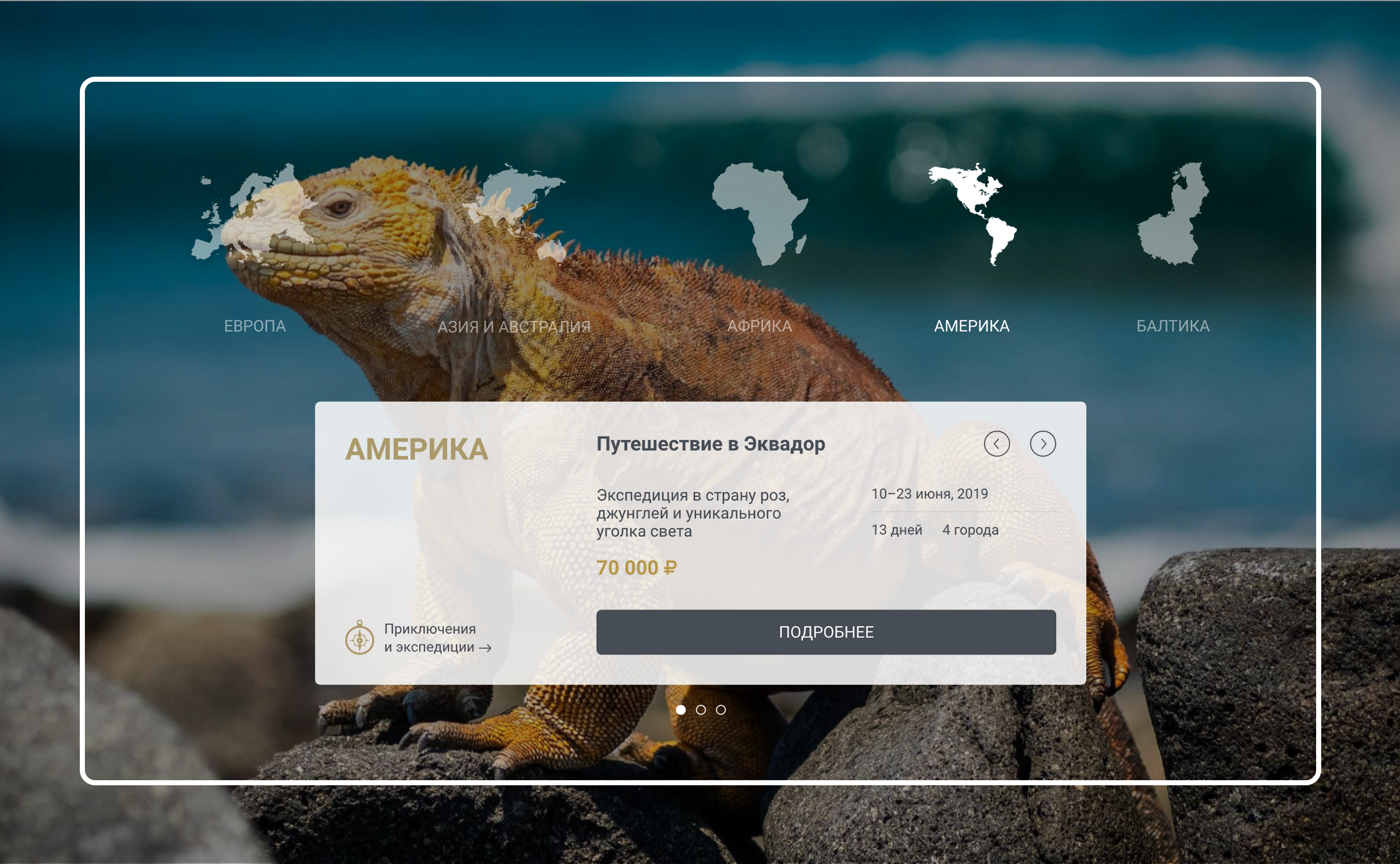 Второй способ – более визуальный: при выборе континента меняется картинка на заднем фоне, а карточки туров – это слайдер.