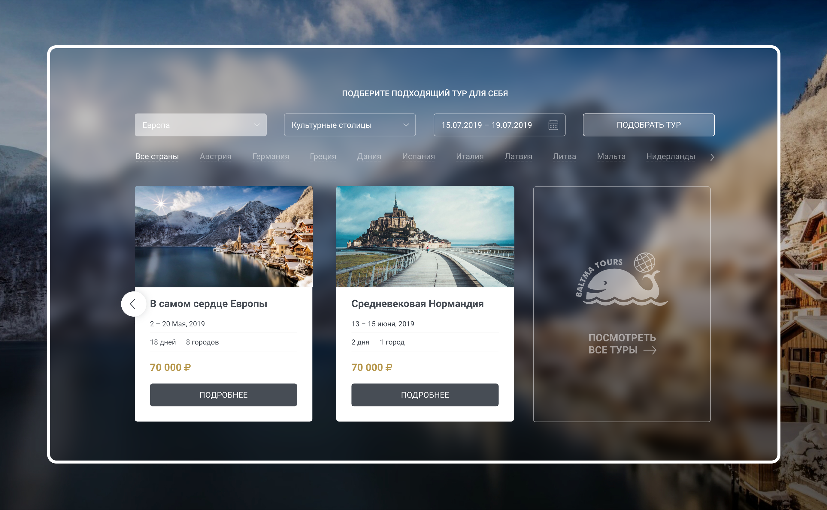 Главная страница: выбор тура