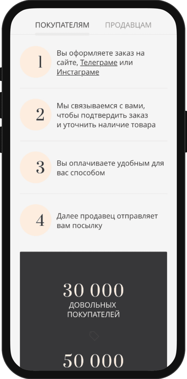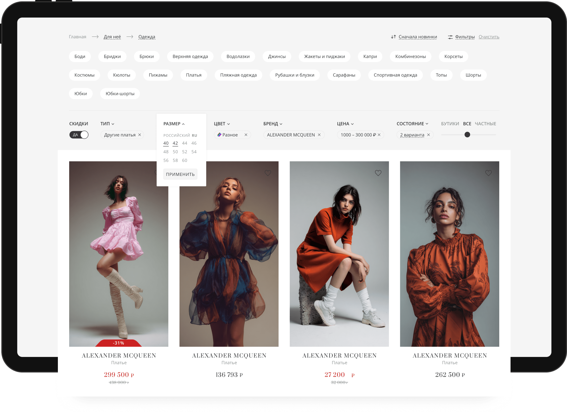 Площадка ориентирована исключительно на ассортимент класса люкс с возможность купить эксклюзивную вещь за невысокую цену относительно рынка.